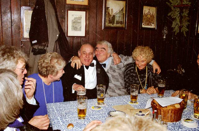 Noch bleibt etwas Zeit, um das Konzertprogramm zu studieren. Bereit, fachkundige Kommentare von Adolf Scherbaum (Mitte) entgegenzunehmen, flankieren Peter Epp (l.) und Friedrich Held (r.) unseren GastNach dem großartigen Auftritt von Mauriçe André und Hedwig Bilgram:Fröhliche Nachfeier im „Bratwurstglöckl“. . .
